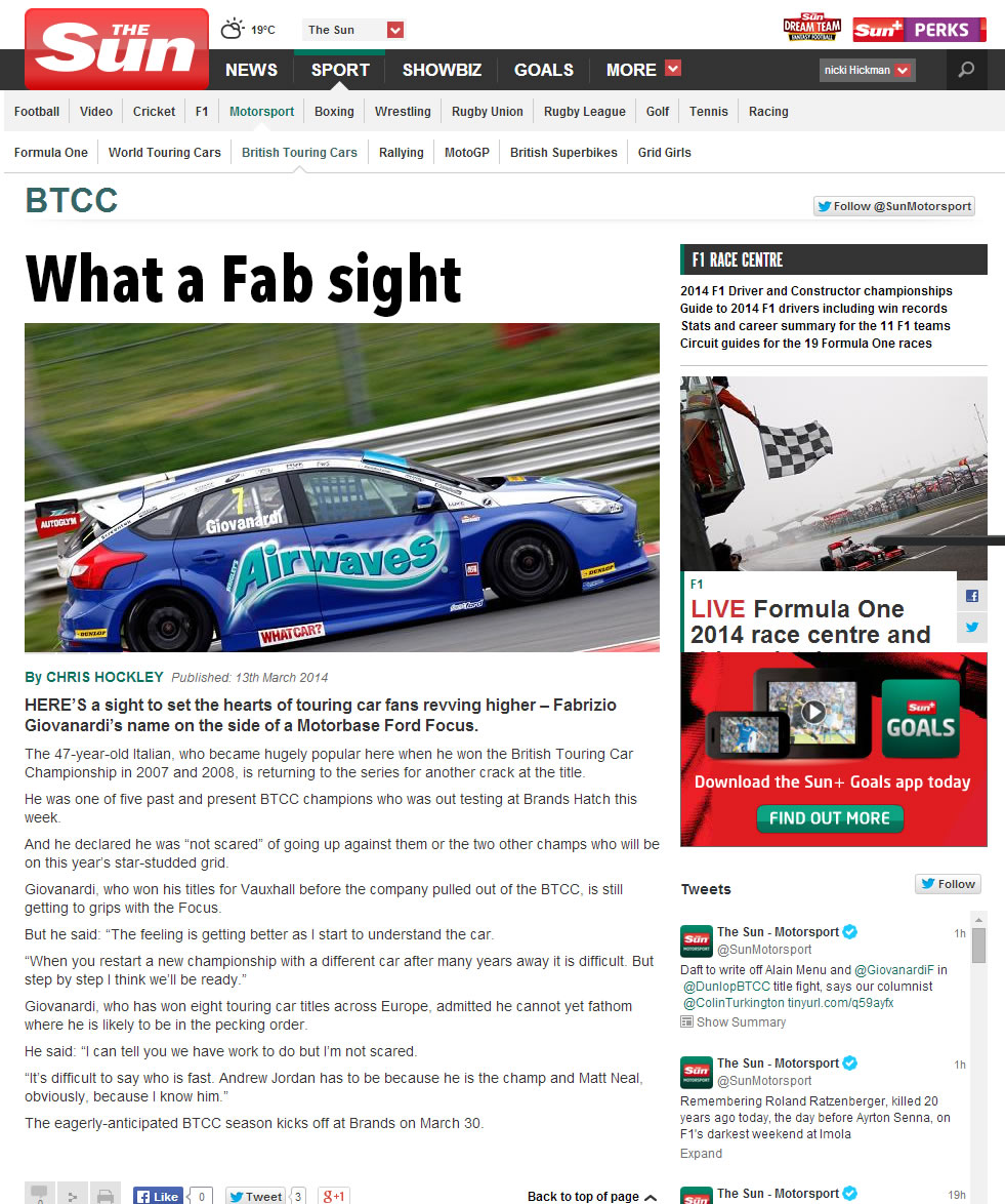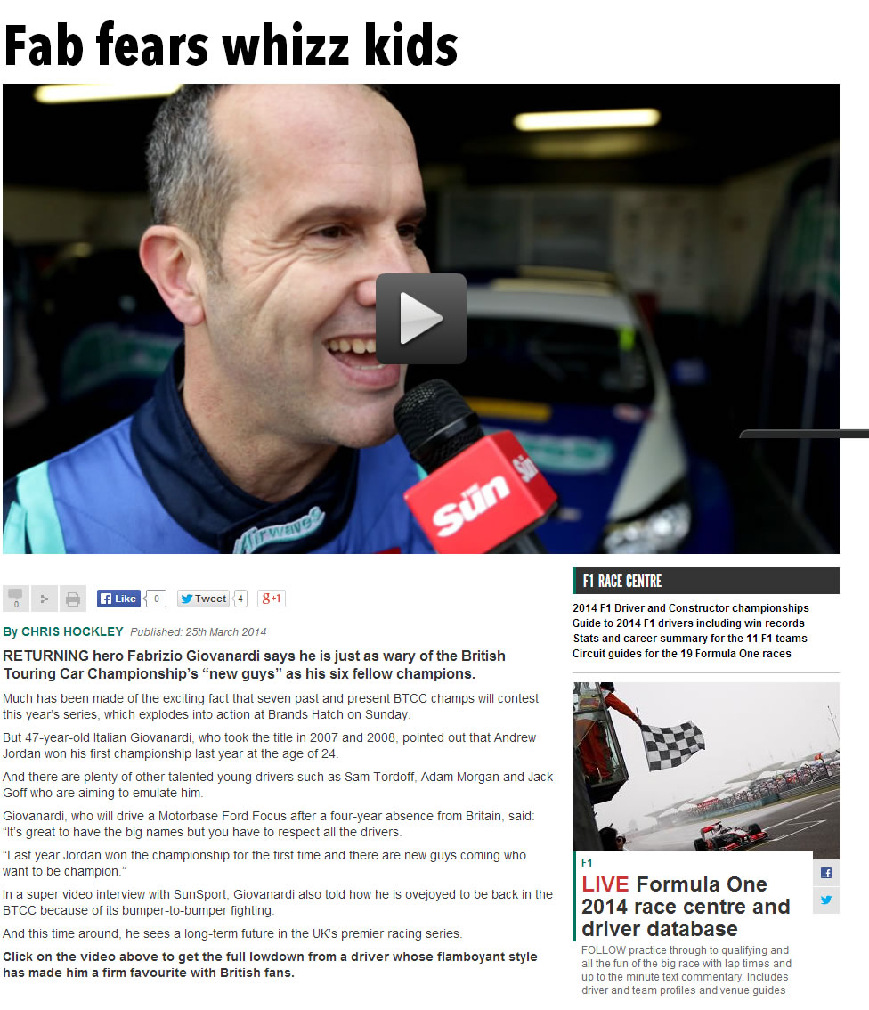 Not so Fab for Champ. The Sun Motorsport section covers Fabrizio’s bumpy return to the 2014 BTCC grid.