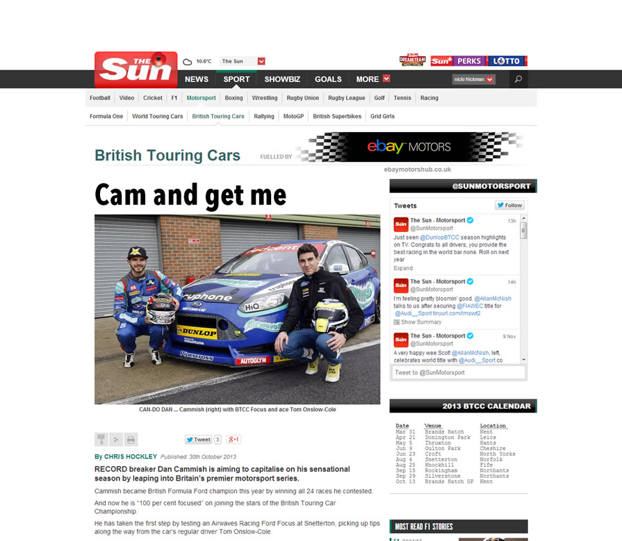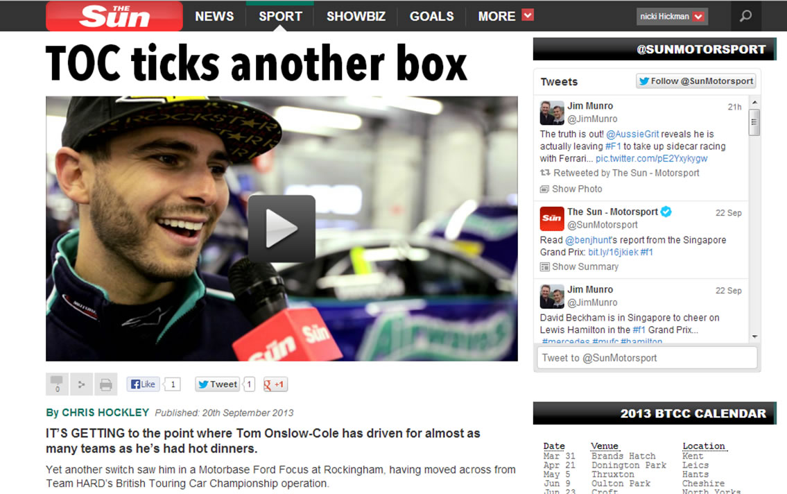 The Sun covers the news of new Airwaves Racing signing Tom Onslow-Cole for the last three rounds of the 2013 BTCC.