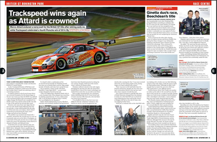 Autosport magazine covers the 2014 Avon Tyres British GT season finale with the Oman Racing Team clinching the Teams’ Championship Title.
